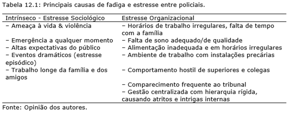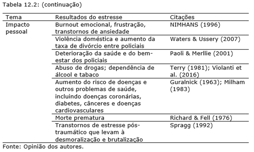 É importante questionar o impacto do estresse sobre os policiais, visto que ele é uma parte inevitável de seu trabalho. Além disso, como parte do rigoroso treinamento na academia de polícia, os recrutas passam por um ambiente estressante para combater o estresse e a fadiga esperados (Patterson, 2016). Os policiais são treinados em um ambiente altamente intenso, de estilo militar, para criar a percepção de serem fortes física e mentalmente. Isso garante que os policiais nunca pareçam frágeis e vulneráveis (Rose & Unnithan, 2015). Apesar disso, diversos estudos indicam que o estresse causa um impacto significativo sobre os policiais (ver Tabela 12.2).
