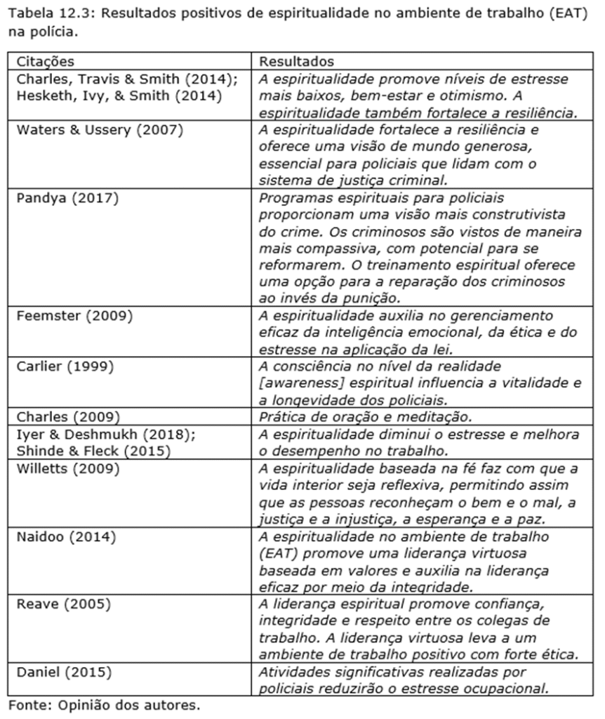 Além disso, esses recursos são mais voltados para o tratamento do que para a prevenção. É semelhante à vacinação, que é essencial quando há alto risco de infecção por um vírus. Nessas situações, o foco principal deve ser a prevenção. Portanto, implementar a espiritualidade no ambiente de trabalho como ferramenta de prevenção pode ser uma opção, especialmente para policiais. Dåderman e Colli (2014) enfatizaram a necessidade de espiritualidade nos policiais e na organização policial, considerando o impacto holístico que a espiritualidade tem no bem-estar mental para combater o estresse agudo (Dåderman & Colli, 2014). Veja a Tabela 12.3 para um resumo dos resultados positivos da espiritualidade na força policial.
