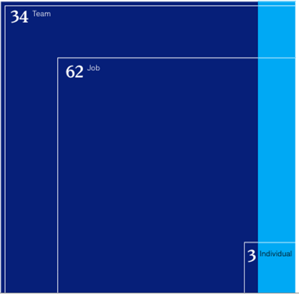 Comparativamente, ao analisar funcionários com sintomas de burnout, em nosso modelo, fatores do local de trabalho em nível individual preveem 3% das diferenças entre funcionários com burnout, enquanto aqueles em nível de cargo preveem 62%, em nível de equipe preveem 32% e em nível de organização preveem 1%. Noventa e quatro por cento da variância explicada é impulsionada por fatores em nível de cargo e equipe.