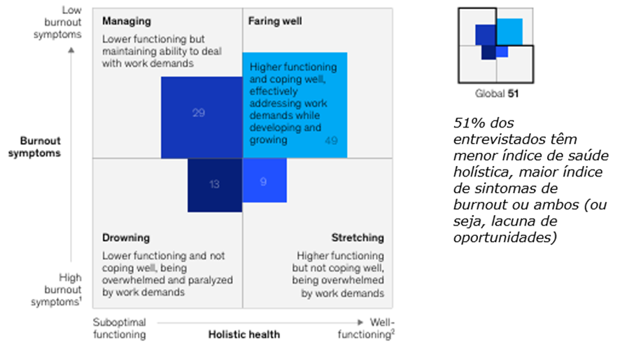 Em nível global, nós constatamos que aproximadamente metade dos funcionários (49%) está ‘se saindo bem’ (‘Faring well’, no gráfico) — apresentando bom desempenho em todas as dimensões da saúde holística e, simultaneamente, apresentando baixas taxas de sintomas de burnout. No entanto, uma média de 9% dos funcionários está ‘se expandindo’ (‘Stretching’, no gráfico) — apresentando bom desempenho em todas as dimensões da saúde holística e, simultaneamente, apresentando altas taxas de sintomas de burnout. Quase um terço dos funcionários está ‘gerenciando’ (‘Managing’, no gráfico) — apresentando desempenho abaixo do ideal em todas as dimensões da saúde holística e, simultaneamente, apresentando baixas taxas de sintomas de burnout. O grupo com mais dificuldades é o dos funcionários que estão ‘se afogando’ (‘Drowning’, no gráfico) — apresentando desempenho abaixo do ideal em todas as dimensões da saúde holística e altas taxas de sintomas de burnout. O Quadro 5 mostra a porcentagem de funcionários que pode ser aprimorada ao atender simultaneamente às demandas e desenvolver facilitadores para os funcionários. Chamamos isso de lacuna de oportunidades.[15]