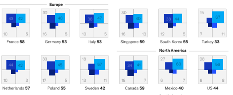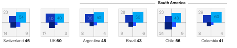 O MHI explorou o desempenho dos trabalhadores em nossa amostra global tanto em relação à saúde holística quanto aos sintomas de burnout nos 30 países pesquisados (Anexo 5). A presença de saúde holística positiva não significa ausência de sintomas de burnout. Eles são negativamente correlacionados, mas não são dois lados opostos do mesmo espectro. Burnout e saúde holística são capazes de coexistirem.[14]