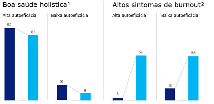 Boa saúde holística relatada e altos sintomas de burnout, por autoeficácia no trabalho, % de participação