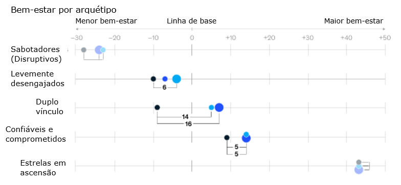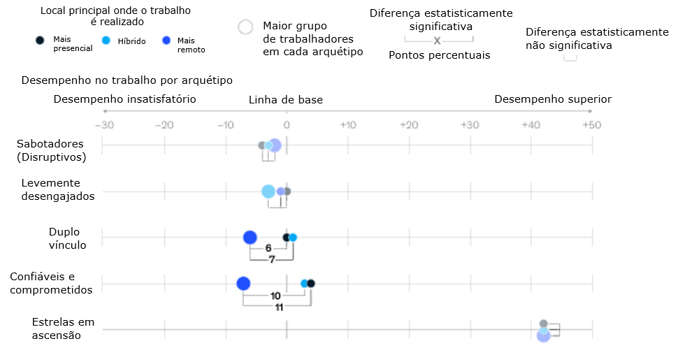 Os grupos que são desengajados (ou seja, os sabotadores (disruptivos) e os levemente desengajados) sentem que o desempenho deles está abaixo da média, que o bem-estar deles está sendo prejudicado, ou ambos. Os confiáveis e comprometidos tendem a se sair melhor e encontrar equilíbrio em um ambiente híbrido, visto que o trabalho mais presencial afeta negativamente o seu bem-estar e o trabalho mais remoto afeta o seu desempenho percebido. Os estrelas em ascensão relatam níveis semelhantes de desempenho e bem-estar em todos os modelos, embora haja mais deles em modelos híbridos ou remotos.