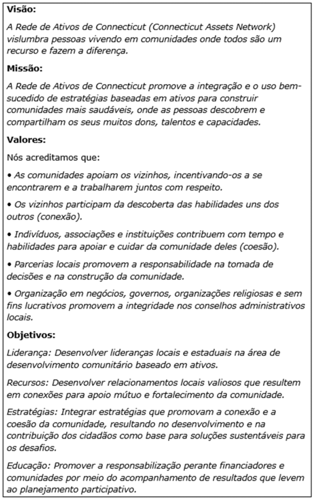 As abordagens baseadas em ativos reconhecem o valor do capital social presente nos relacionamentos e interações entre grupos comunitários e indivíduos. Um exemplo de tal iniciativa de desenvolvimento comunitário baseada em ativos é The Connecticut Assets Network (CAN; http://www.ctassets.org/about/index.cfm), uma rede comunitária sem fins lucrativos que promove a integração e o uso bem-sucedido de estratégias baseadas em ativos para o desenvolvimento comunitário. A organização acredita que os membros da comunidade devem se conectar e participar de conversas “para desenvolver relacionamentos ricos em ativos, onde as pessoas descobrem os seus muitos dons, talentos e capacidades para a resolução de problemas mutuamente benéficos”. Para enfatizar a importância da linguagem baseada em ativos como um princípio fundamental, a CAN tem desenvolvido uma visão, missão, valores e objetivos que ilustram a filosofia afirmativa que guia o trabalho deles (ver Figura 1.1).