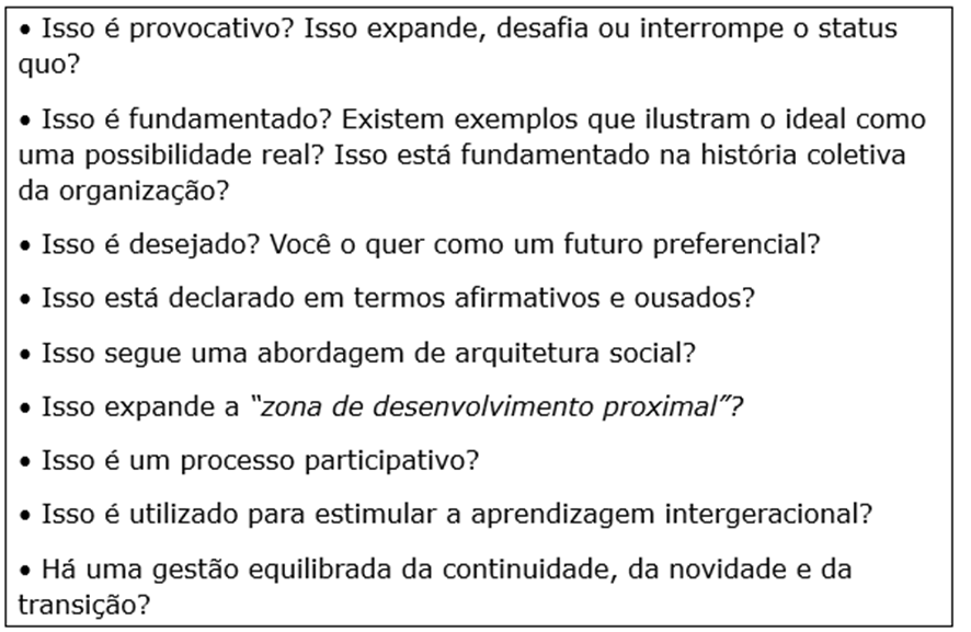 4. O Princípio da Antecipação: Os recursos mais importantes que nós temos para gerar mudanças ou melhorias organizacionais construtivas são a nossa imaginação coletiva e o nosso discurso sobre o futuro. Ou seja, a nossa imagem do futuro é o que nos guiará na determinação de como nós alcançaremos o futuro. Quanto mais positiva e esperançosa for a imagem do futuro, mais positiva será a ação no presente.