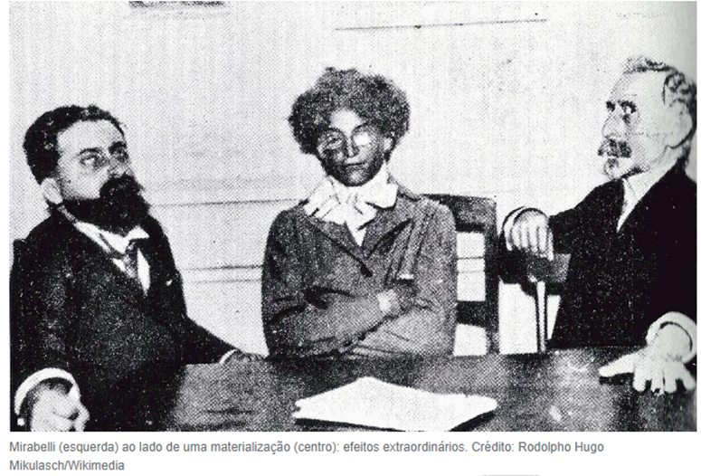 ‘[Os fenômenos de materialização de Mirabelli] eram impressionantes. As figuras não só estavam completas, como também foram fotografadas [vide foto acima] e médicos realizaram exames minuciosos que duravam, por vezes, até quinze minutos e afirmaram que os seres humanos recém-constituídos possuíam estrutura anatômica perfeita. Após o exame, a figura começou a se dissolver dos pés para cima, com o busto e os braços flutuando no ar. Um dos médicos exclamou: ‘Mas isso é demais!’ e correu para a frente, agarrando metade do corpo. No instante seguinte, ele soltou um grito agudo e caiu inconsciente no chão. Ao recobrar a consciência no nível da percepção [consciousness], ele se lembrou apenas de que, ao agarrar o fantasma, sentira como se os seus dedos estivessem pressionando uma massa esponjosa e flácida. Então, ele recebeu um choque e perdeu a consciência no nível da percepção [consciousness]. Durante trinta e seis minutos, em plena luz do dia, a materialização da filhinha do Dr. Souza, que morreu de gripe, foi visível a todos os presentes. Ela apareceu com as suas vestes funerárias. O seu pulso foi testado. Pai e filha foram fotografadas. Então o fantasma se ergueu e flutuou no ar…