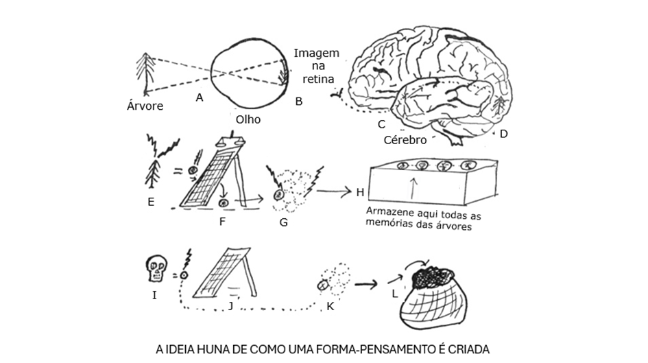 J. Devido ao choque da visão, o self médio não filtra nem racionaliza a forma-pensamento criada pela impressão sensorial da caveira (ou qualquer outra coisa chocante). A forma-pensamento é então carregada e armazenada com outras formas-pensamento de memória não relacionadas.