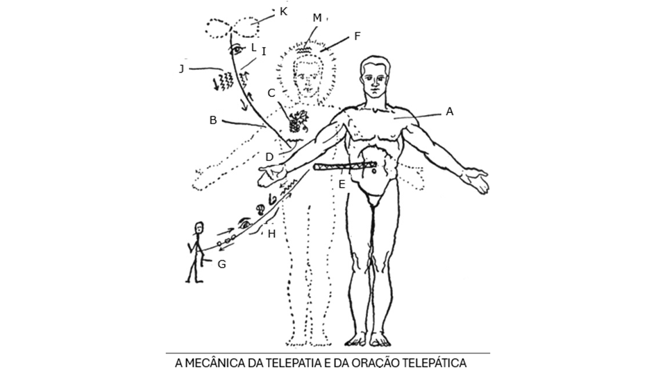 H. O fio ou cordão de substância do corpo sutil que conecta o homem a uma pessoa distante (como explicado em G). Ao longo do fio de conexão flui força vital de baixa voltagem e formas-pensamento, ambas se movendo em direção aos experimentadores e vice-versa. Os pequenos círculos representam os pensamentos como formas-pensamento, mas esses naturalmente se agrupariam para formar ideias ou impressões completas, obtidas por uma extensão das faculdades sensoriais ao longo do fio para ver, ouvir, cheirar, saborear etc. e trazer relatos. Os Kahunas simbolizavam essa extensão dos órgãos sensoriais ao longo dos fios sutil como ‘estender um dedo’ ou ‘uma orelha’, etc. Os órgãos sensoriais são duplicados no corpo sutil, de modo que o self básico, quando fora do físico, como em viagens astrais ou após a morte, ainda possa ver, ouvir, saborear, etc.